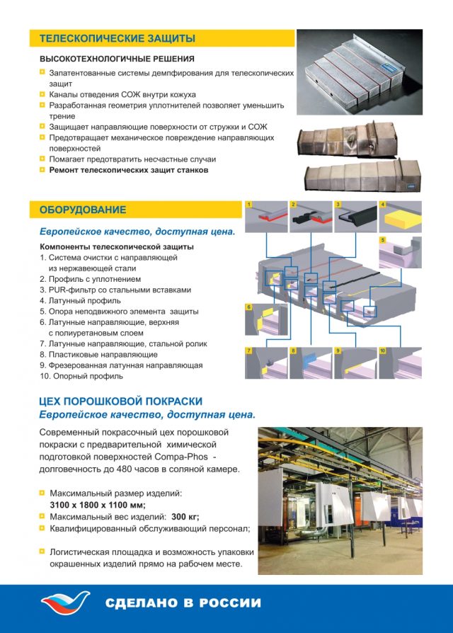 Производство разрабатывает и производит телескопические кожухи (телескопическую защиту), кронштейны для кабелей (кабель-каналы) IDEALFLEX, очистители (стиратели или истиратели) направляющих поверхностей, кроющие гармошки (защитные меха) (лепестковая защита), телескопические пружины, рулонные покрытия, секционные перегородки, зажимные системы, поворотные окна VISIPORT, кабинетную защиту (модульную защиту) и множество других деталей.