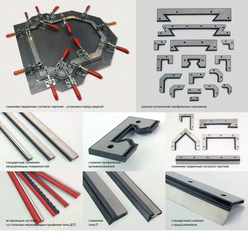 Фирма предлагает решение для истирания направляющих поверхностей станков. Применение съемников помогает сохранить точность и продлить срок службы направляющих поверхностей. В зависимости от их вида, съемники можно привинтить, приклепать, приклеить или приварить точечной сваркой к несущему профилю.